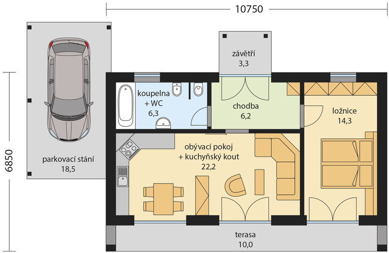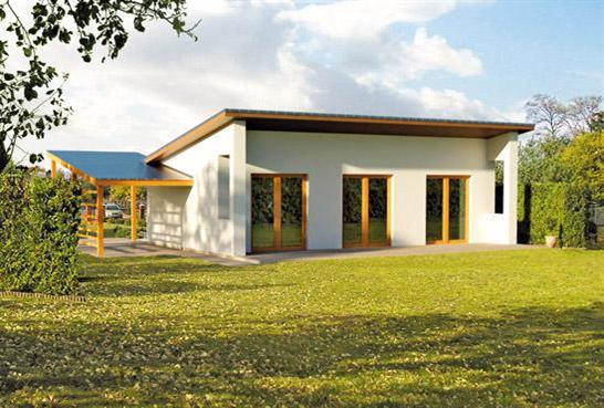 Rodinný dům JANA je menší přízemní rodinný dům s parkovacím stáním. Jednoduchá dispozice – obývací pokoj propojený s kuchyňským koutem, ložnice a koupelna, umožní bydlení 2 členné rodině. Krytým závětřím se vstoupí do chodby, ze které je vstup do všech místností. Z obývacího pokoje i ložnice je vstup na terasu, která je částečně zastřešena. V ložnici lze vybudovat samostatnou šatnu.